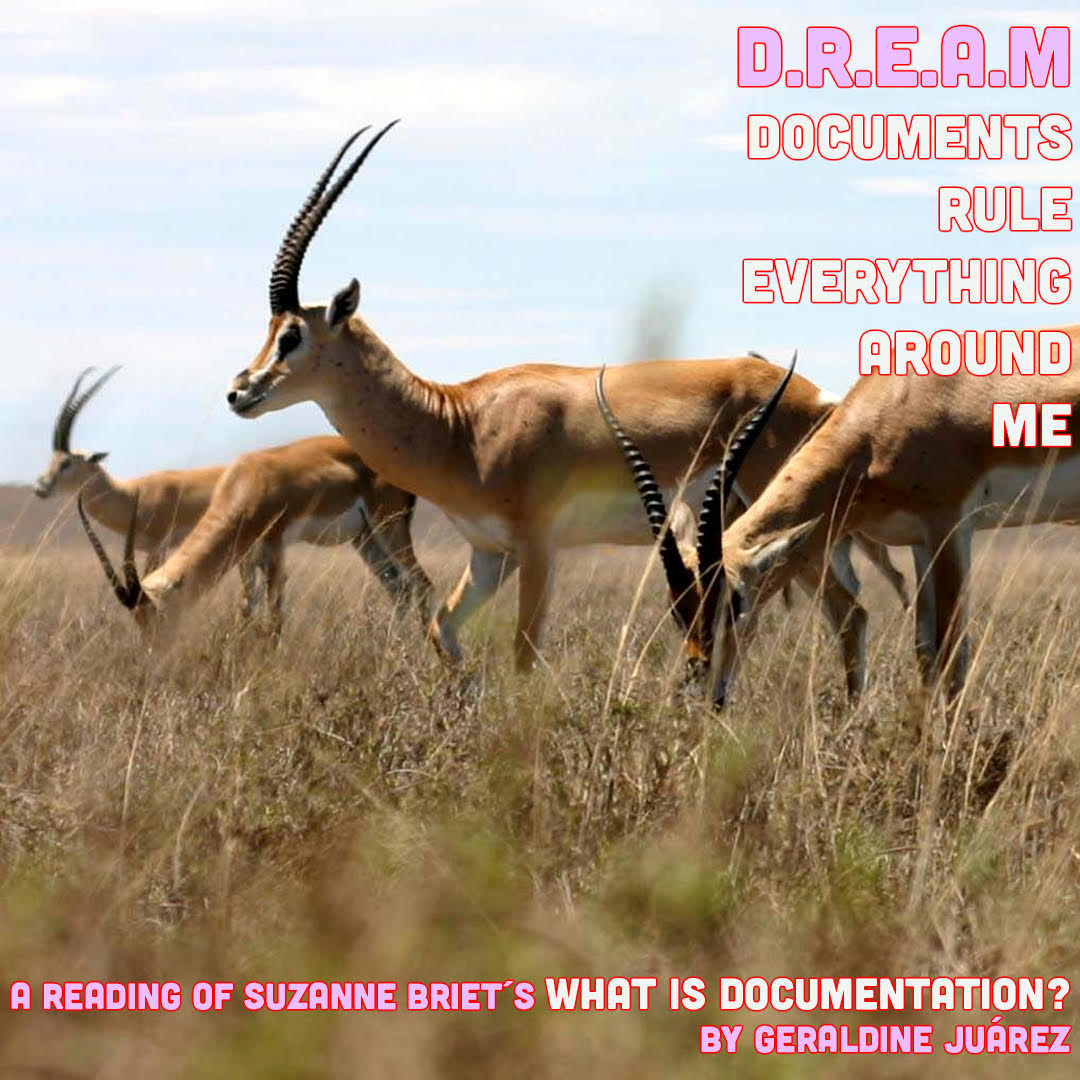 D.R.E.A.M is a live-reading of selected passages of "What is Documentation" (1951) by Suzanne Briet's – also known as Madame Documentation. Briet (France, 1894-1989) was a prolific and imaginative teacher, librarian, poet and pioneer of Documentation. She made available to the public bibliography that was forgotten in basements during the war but also work for the constitution and development of what she considered Documentation but later (and partly because of the concentrated in the so called "Father of Information Science" Paul Otlet) – was called Information Science. Specially relevant is the attention she put in the impact of information technology in the labour of documentarians: "Homo-documentator must prepare himself to take command –with all his senses awake- over the robots of tomorrow", she wrote. She became Vice President of the International Federation for Documentation (FID) and acquired the nickname "Madame Documentation." From the printing press, transcription, sketching, photocopying, scanning or streaming, distant objects are brought into proximity via documentary techniques – or documentation – which Briet considered a cultural technique in its own right. In a time where collective knowledge and intellect is being processed and documented, simultaneously with its production via streaming and in order to cover the demands of the labour market under the restrictions posit by the management of the pandemic; D.R.E.A.M is a reading that center our screen-attention in Briet to focus in the difference between objects and documents, our role as what she called "homo-documentators" and as such, our relation with the political economy of Documentation and therefore, the way in which knowledge shape our dreams.